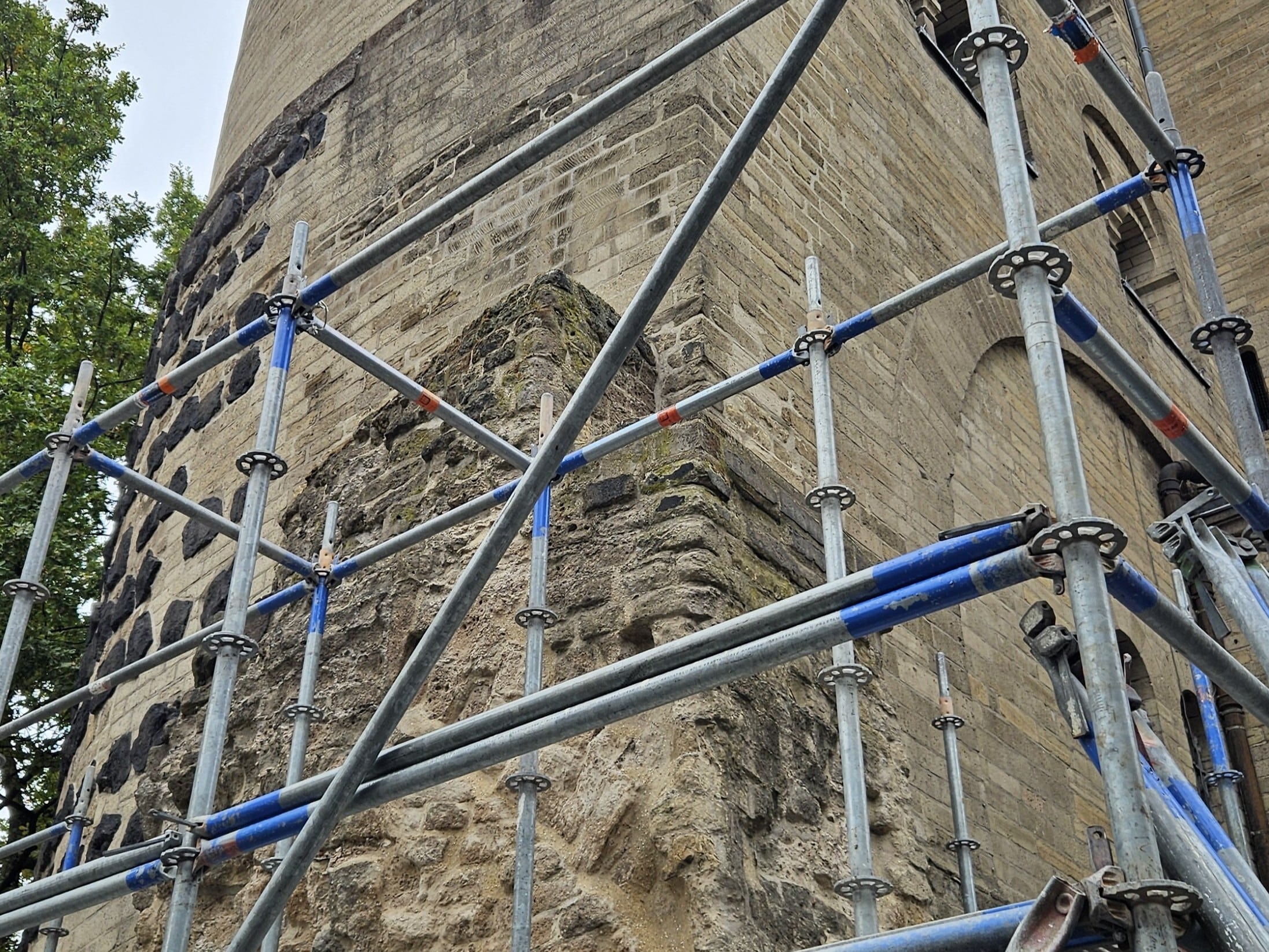 Mit dem Gerüstbau haben heute am Dienstag, 30.09.2025 die Maßnahmen zum Erhalt der Bausubstanz des Westturms der Eigelsteintorburg begonnen.