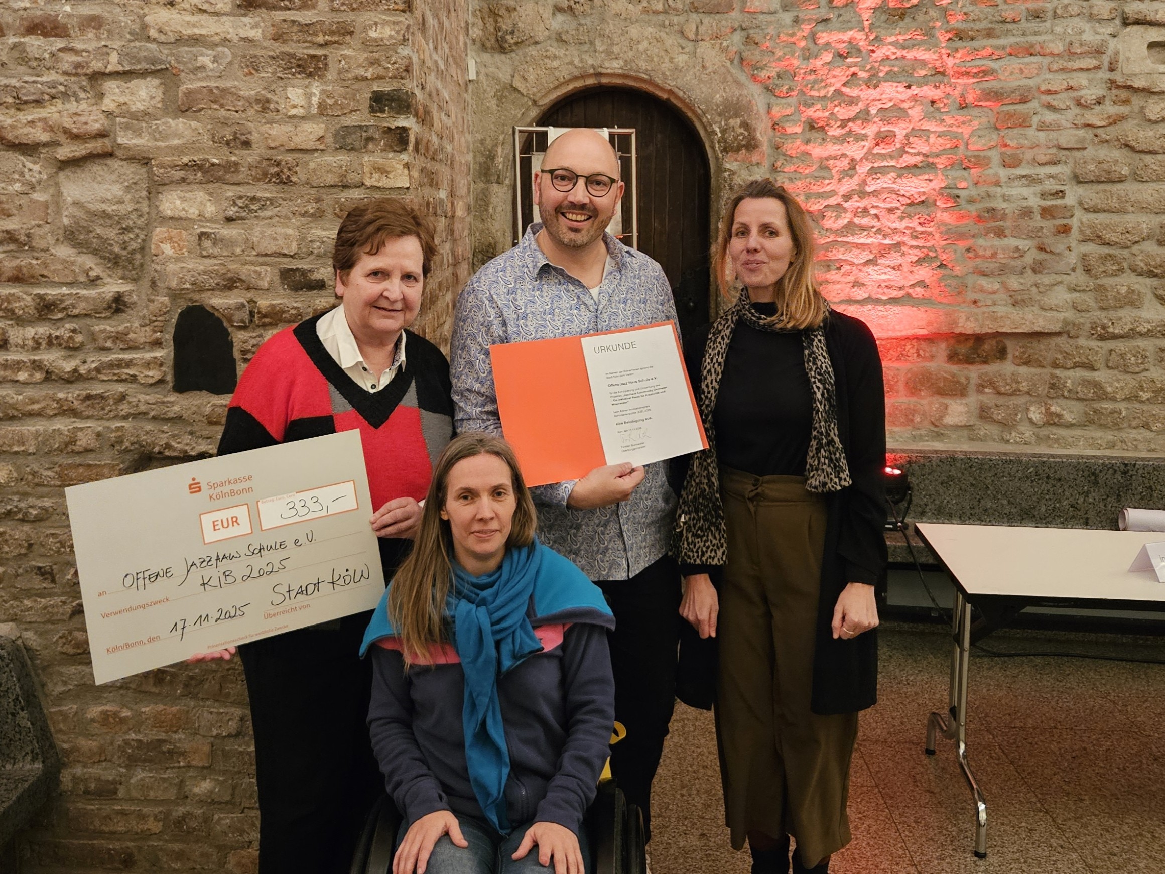 Die Stadt Köln hat am Montagabend, 17. November 2025, den Kölner Innovationspreis Behindertenpolitik (KIB) im Gürzenich verliehen. Um die Teilhabe von Menschen mit Behinderungen und die darin liegenden Chancen für die städtische Gemeinschaft stärker ins Blickfeld zu rücken, vergibt die Stadt Köln, vertreten durch Oberbürgermeister Torsten Burmester, gemeinsam mit den Mitgliedern der Stadtarbeitsgemeinschaft Behindertenpolitik seit 2008 den Kölner Innovationspreis Behindertenpolitik. Die Offene Jazz Haus Schule erhielt in diesem Rahmen für die Konzeptionierung um Umsetzung des Projekts "Jazzhaus Community Orchester - Ein inklusiver Raum für Kreativität und Miteinander" eine Belobigung. Jenny Dralle und Lilo Ihringer, Mitglieder im Jazzhaus Community Orchester (JCO), sowie Martin Theile und Britta Renes aus dem OJHS-Büro nahmen diese besondere Auszeichnung entgegen.