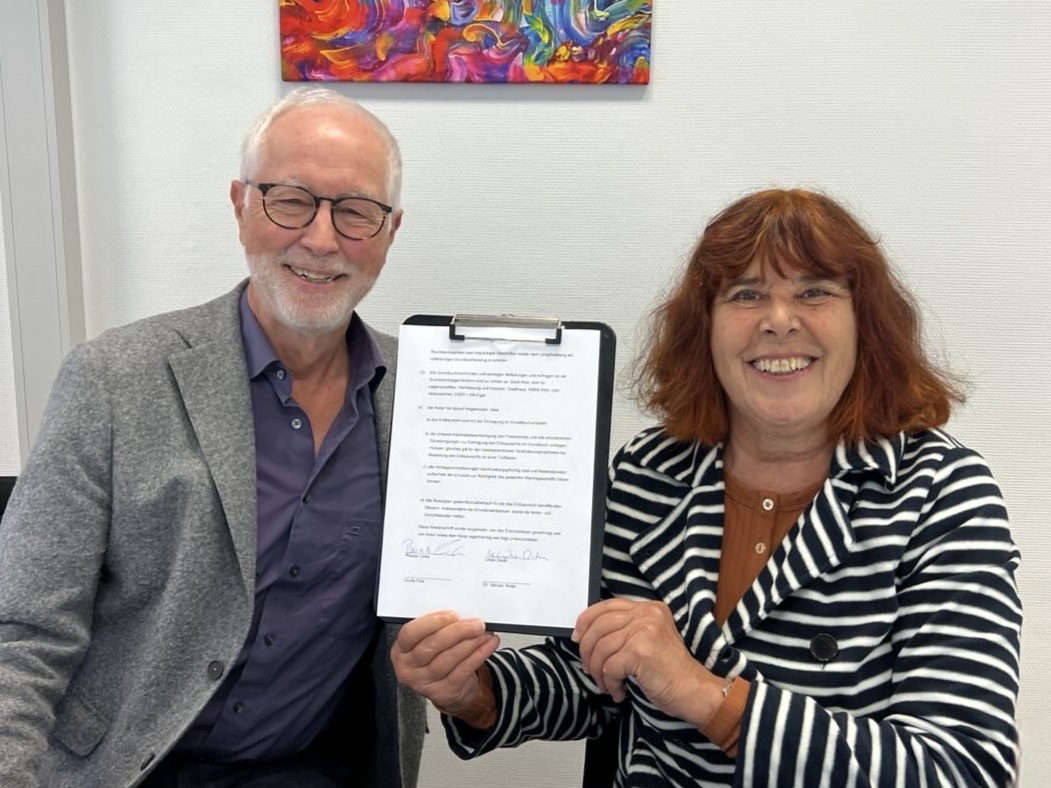 Die Offene Jazz Haus Schule bleibt in der Eigelsteintorburg! Am Dienstag, 23.9.2025 unterzeichneten Rainer Linke (Vorsitzender der OJHS) und Ulla Oster (stv. Vorsitzende der OJHS) den neuen Erbbaurechtsvertrag mit der Stadt Köln.